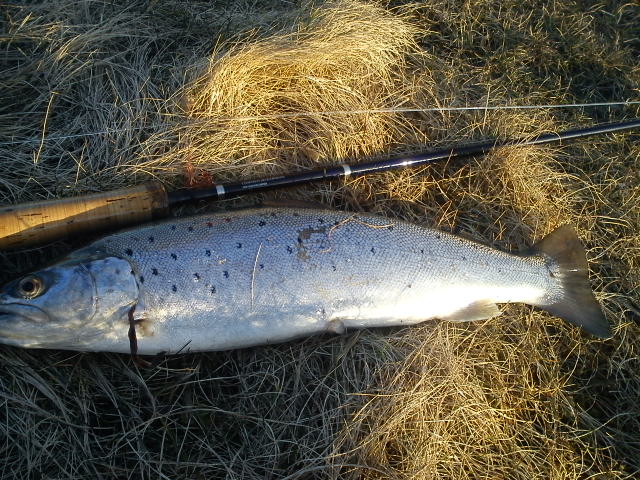 Formodningerne holdt stik for der var allerede fisk der viste sig i overfladen lige efter jeg havde lagt linen ud i første kast. Kobberbassen blev placeret i området hvor havørrederne havde vist sig. To lange træk i linen og der var kontakt. Dagens første trutta var kroget.