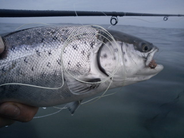 Denne morgen er helt sikkert en af gode når man engang husker tilbage. Fluestangen var ladt med kobberbassen og klart til kamp kl 5 og der var en let pålandsvind på kystpladsen nord for Havnsø. Min fiskekammerat Danny var allerede kommet og stod på “hot-spot”. På vej hen mod det andet “hot-spot” ville jeg lige prøve et mørt område som næsten lå i baglommen på Danny. Her var der liv. I første kast med kobbberbassen var der løse skæl som snuppede fluen og en fin 49 cm´s ørred fik et “rest in peace” da det var kommet i land. I næste kast var der en mere i samme størrelse som tog fluen men desværre slap krogen sit tag.