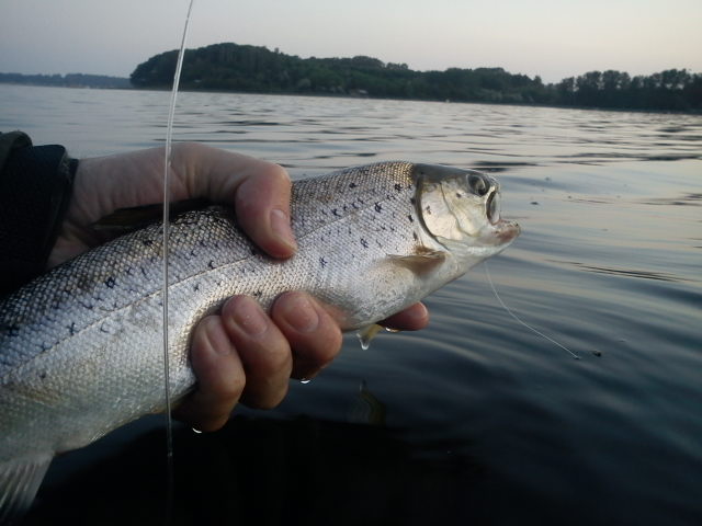 Lyset kommer tidligt disse dage så det gælder om at være på plette ved 4 tiden. Denne var jeg taget til østsiden af fjorden for lurer nogle havbasser med kobberbassen. Allerede i andet kast var dagens første ørred i hus. Den kæmpede helt vildt og efter 6-7 hop helt fri af vandet kunne ørreden (43cm) endelig håndlandes og nænsomt genudsættes.