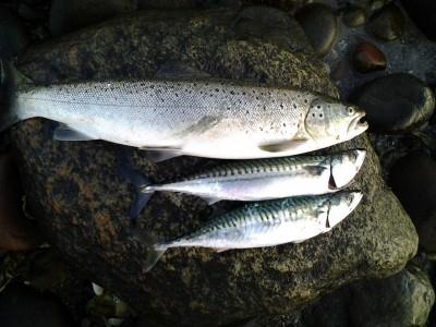 Hornfisk, Ørred, Makrel og Ørred har desuden set en del Multer, det er første gang jeg har fanget Makreller på flue fra kysten, har fået i alt 6 stk, i dag har jeg hjemtaget 2 pæne Makreller og en Ørred på 59 cm. (1,65 kg,.)