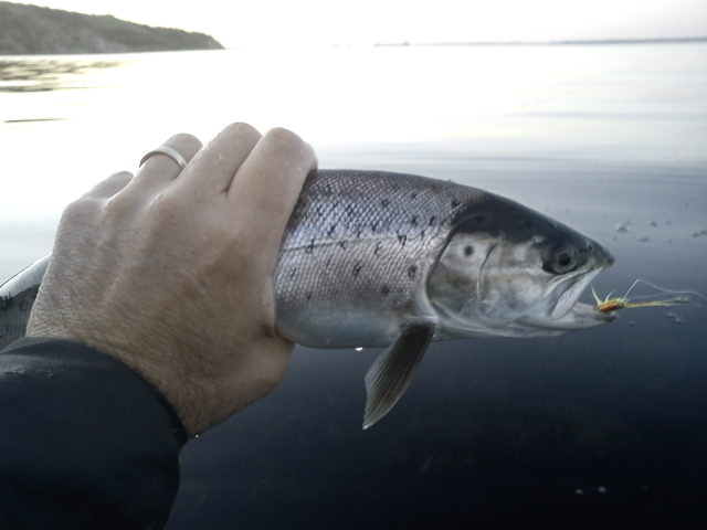 Den første måls-havørred huggede hårdt på tobis-fluen efter at have vist sig i overfladen. Tilbage i baljen med den.
