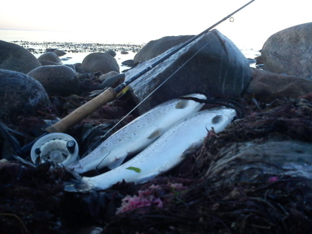 Jeg gik videre på strækningen og så jagende havørreder helt inden under land. Jeg var hurtigt derovre og lagde fluen ud i området. Der gik ikke mange sekunder før at der var bid på en fin 50+ havørred. Efter en fed fight kunne røg den “lædersnoren”. Lidt senere var der bid på 50+er det kom også med hjem. Det blev til et par havbasser mere ….