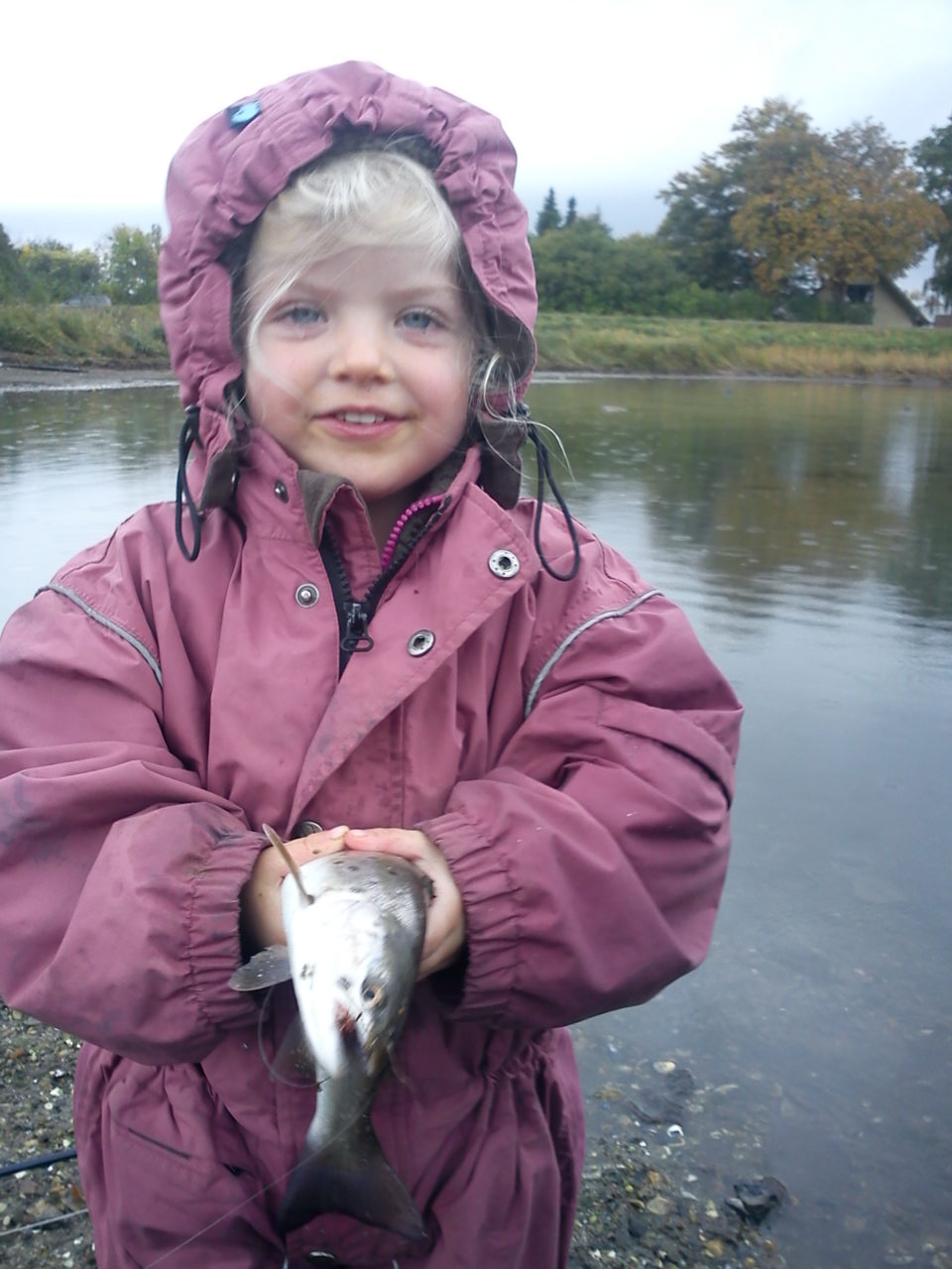 Clara fik den anden ørred der skulle i land – det var hendes første selv trukket i land ørred. Hun klarede det rigtig flot og var stolt da fisken kom i land og skulle tilbage i baljen:-)