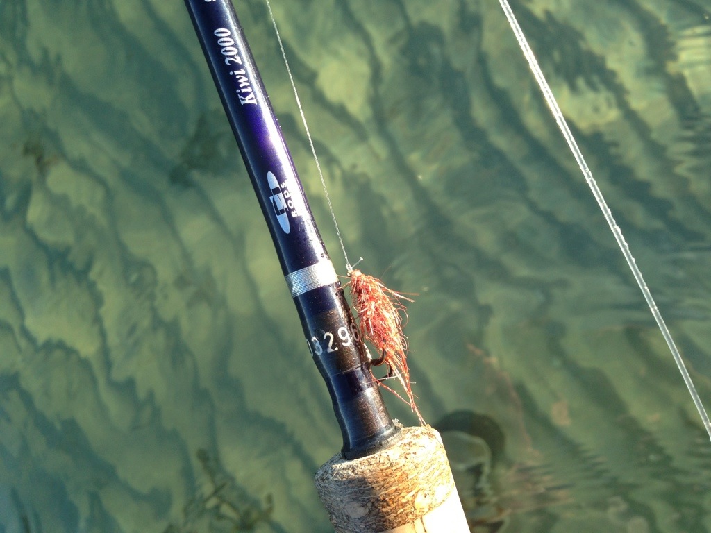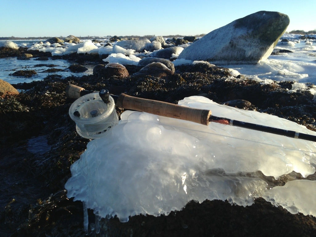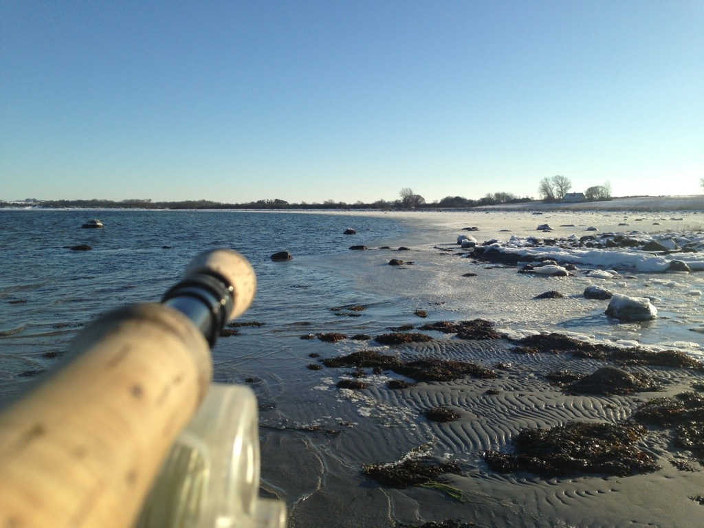 Som det ses på billederne var det ikke lige til at komme ud med “snøren”. Det lykkes dog med lidt besvær at nå til blæretangsbæltet. Strækningen kunne nu vades igennem med en kobberbasse-flue uden at mærke noget “sølvtøj”. Sølvtøjet må gemmes til foråret hvor denne plads fisker godt:-)