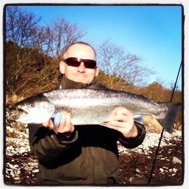 “1.marts højt solskin og alligevel en skarp vind fra nordvest. Der er stadig is i fjorden og nordvest er aldrig godt så tidlig på sæsonen. Og alligevel…..kunne man finde et sted i Sydøstsjælland med vinden i ryggen og solen bagende ind på kysten ku det nok lokke lidt aktivitet ind på det kystnære vand. Jeg havde aftalt en fyraftentur med min fiske-buddy og gode ven Peter Paranowski. Da vi ankom så det perfekt ud. Let farvet vand. God rygvind og normal vandstand. Bare det at være der og på det tidspunkt var perfekt. Nu manglede bare fisken…..egentlig ikke. Det var bare rart at være på rigtig sted og tid…..luksus i en ellers travl hverdag.;-) vi fik en lille til halsen og snakkede om løst og fast. Kravlede i wadersene og gik ned til vandet. Der var andre fiskere ude, men nattens frost og aftagende måne havde nok lagt en dæmpet på fiskene, men vi fiskede løs ….ingen fisk . Efter 3 timer uden hug blev vi enige om at tage en travetur op ad kysten. Vinden der kom ind fra højre fik det lidt opvarmede vand til at strømme hen over et rev en km til venstre så vi gik der hen ad. Vel fremme blev vi enige om at give området et forsøg. Jeg bandt en ekstra stor kobberbasse (Stinger. 3 krog) på, da det var meget gang i vandet og pænt dybt. Peter gik til højre på det første rev og jeg tog området i baglandet inden det andet rev. Der var store sten og tang i badekarret inde ved land, men ikke højt nok vand til at fiske det af så jeg vadede ud til 1. Revle. 3 kast smakk….. En stor fisk rullede i overfladen….. Jeg kunne mærke den var stor men det kolde vand lagde en dæmper på fighter. Efter 5 minutters drinken gennem tangplanter og mellem sten blev fisken kanet. Sikke en smuk start på foråret…….:-)”