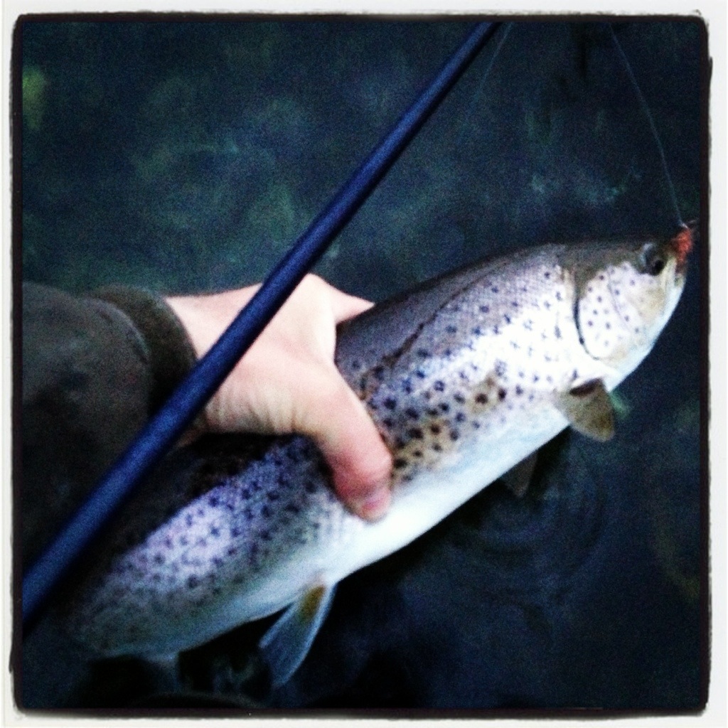 Første havørred var ikke længe om at se Kobberbassen. I tredje kast der en kraftigt opstramning i linen og jeg kunne se en pæn blankside vende under vandoverfladen. De kraftige ryg i stangen afslørede at det var god fisk.