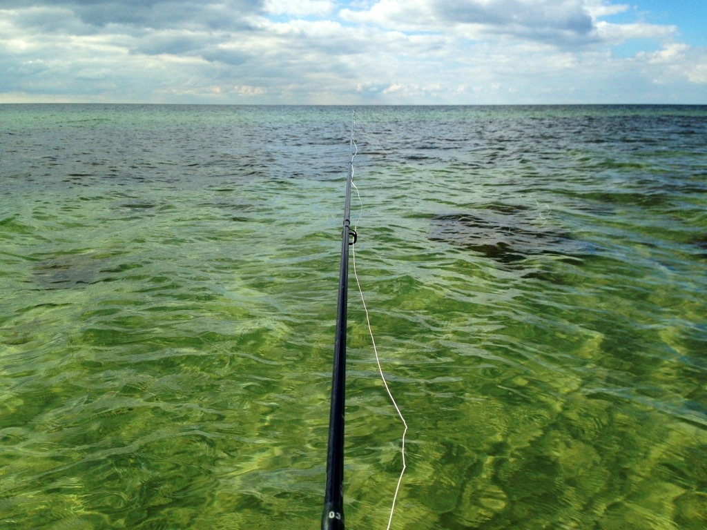 Efter lidt hyggesnak var det tid til at lufte Kobberbassen over “blæretangsbælte” der tæt holder fisk hvis de er inden under land. Jeg affisker strækningen ved at tage flue meget hurtigt ind med lange tag (80 til 100 cm). Så glem linekurven. Den passer ikke så godt til lang hurtig indtagning.