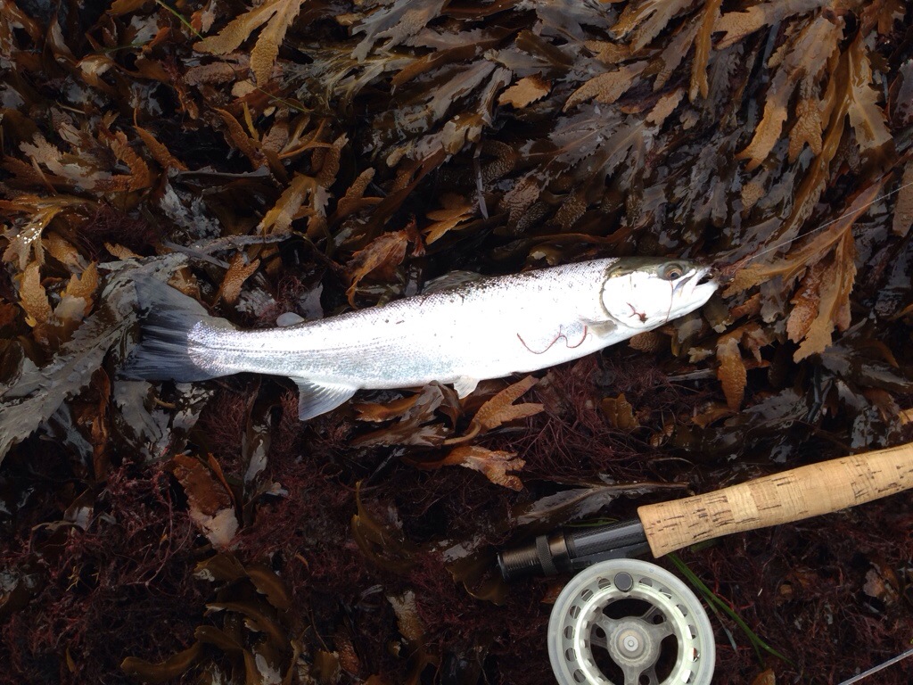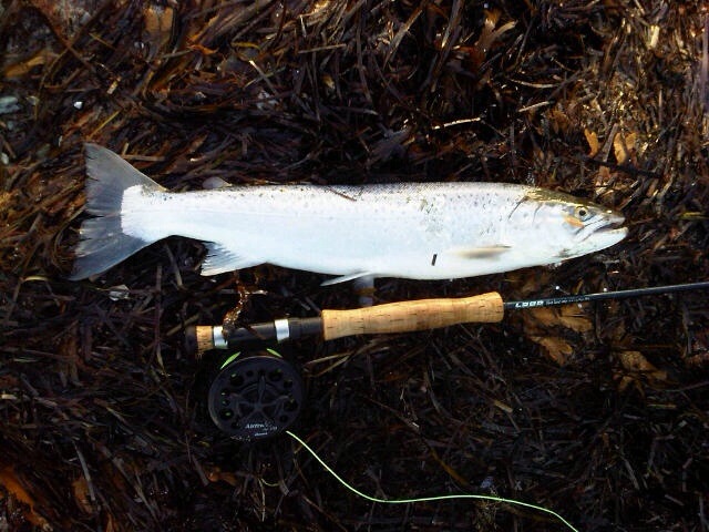 En lille kondo-reje blev monteret. Et forsigtigt kast fra bredden ud mod området med fiskene gav bonus. En mindre havørred havde taget fluen:-)