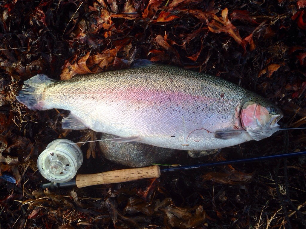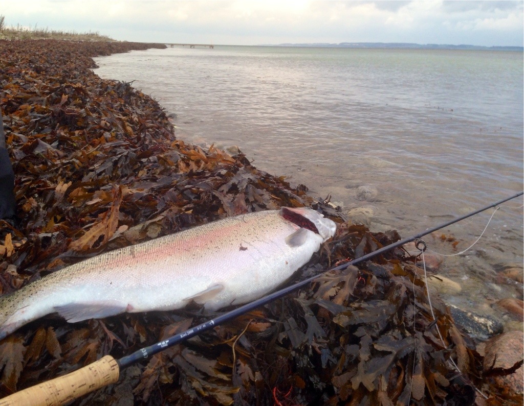 10 minutter senere var der igen en flok som på vej langs kysten. Claus var den første der fik mulighed for at ramme dem i hovedet. Senere fik jeg chancen og denne gang fuldt jeg dem hen langs kysten i let-løb. Pludselig var der en kontant opstramning i linen og overfed regnbueørred gik helt af vandet. Den tog et dejligt langt udløb og jeg fik oprullet al løsline så der ikke blev problemer med blæretangen:-)
