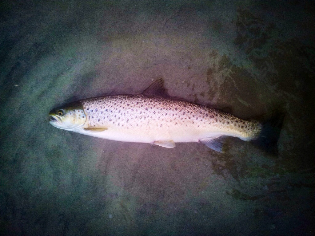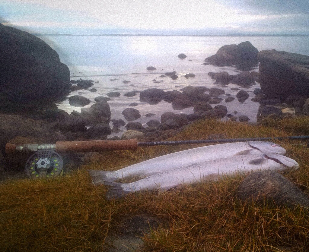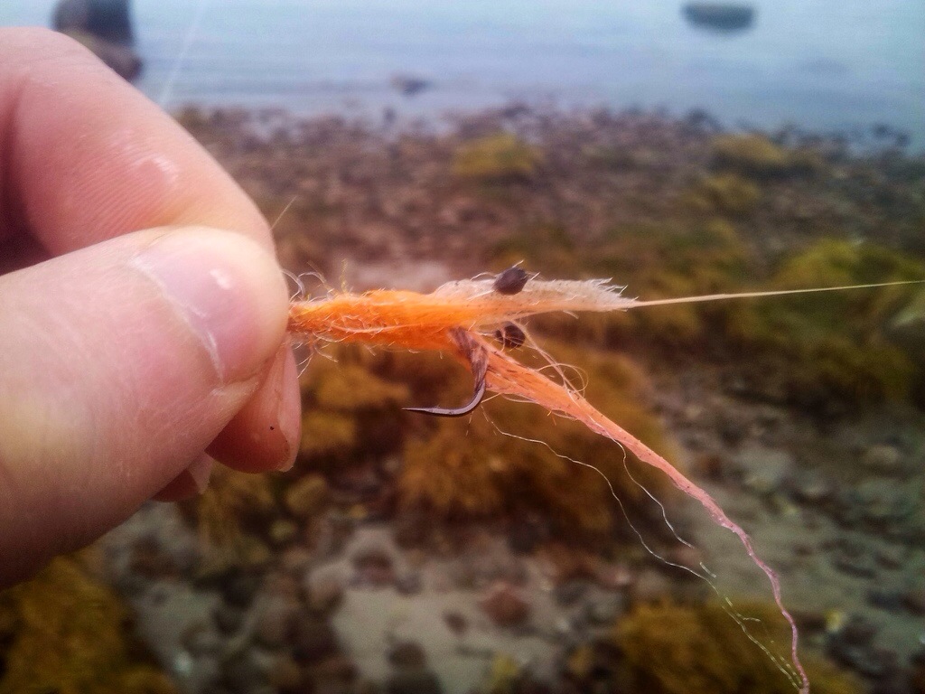 Jeg vadede langsomt ud til et af de af stenrevene. Da jeg kunne se det mærke bælte så jeg en fisk vende i overfladen. Jeg lagde fluen ud til den og den vendte sig efter fluen, men missede den. Endnu et kast og der far fast fisk. En undermåler om omkring 35. Den fik friheden, jeg kastede igen og denne gang vendte en fisk lige ved stangspidsen. Jeg fiskede revet igennem uden at mærke mere.