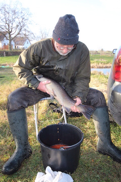 Her på billedet er det undertegnet der får lange arme af de mange havørreder som skal op i sorteringskaret inde de skal have bedøvelse og til strygning for æg.