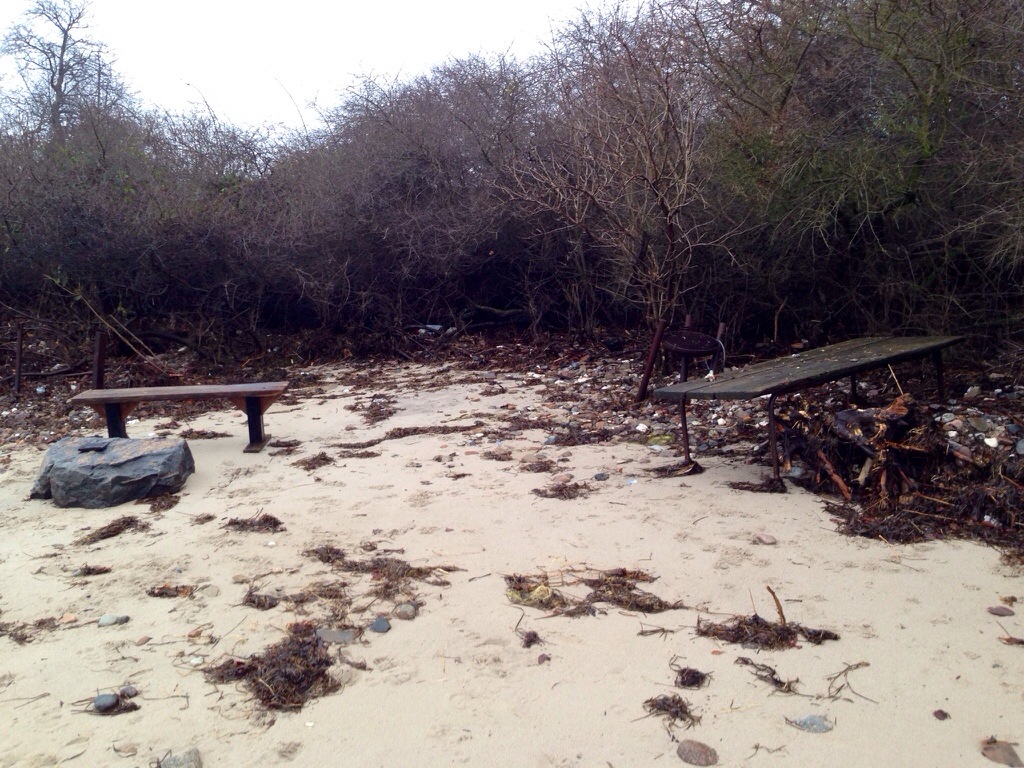 Det var tydeligt at se hvor meget tumult der havde været. Hele græs området var forsvundet og noget af strandsandet var flyttet helt ind i skoven. Skrænter var spist og træernes rødder var skyllet helt fri.
