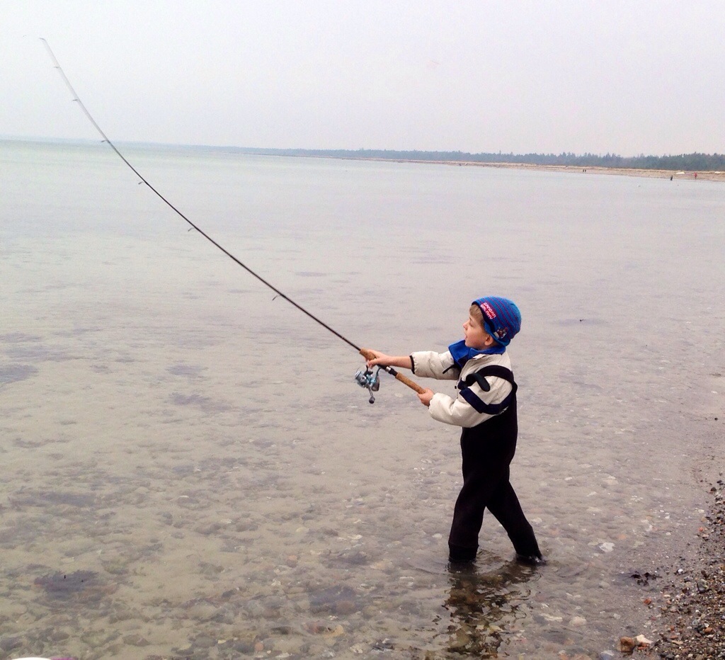 Efter kastetræningen får far lidt egen fisketid mens at der bliver graver “ned til kineserne” som Emil kalder det når der graves dybe huller på stranden.