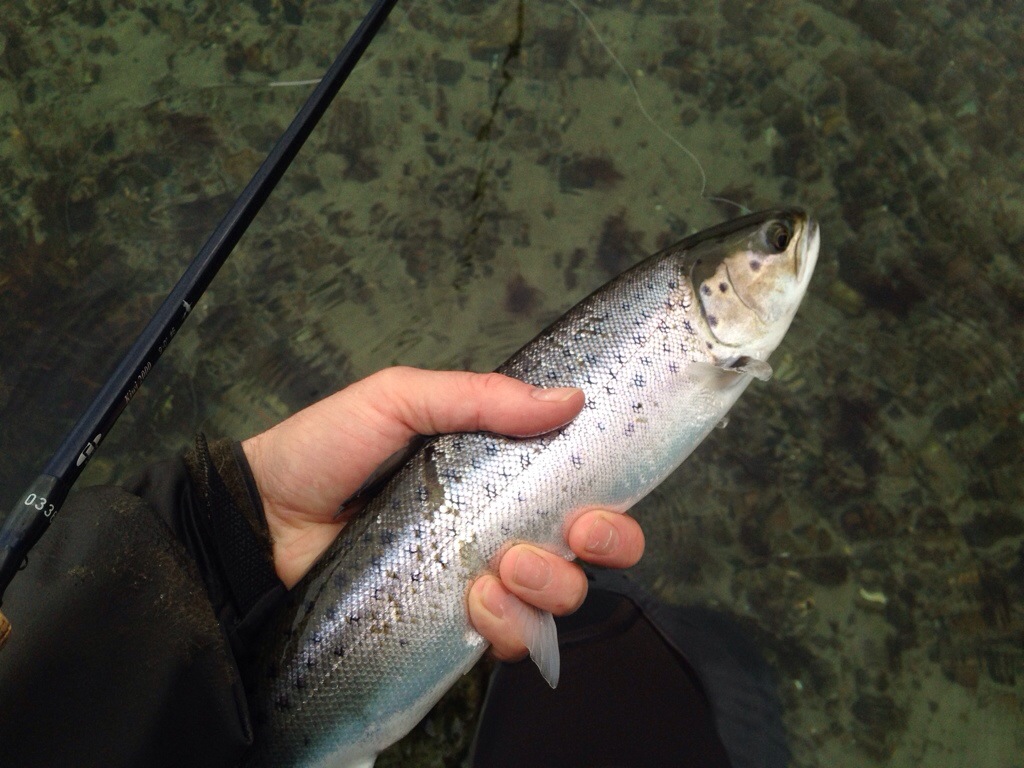 I øjenkrogen ser jeg nogle hvirvler i overfladen 10-12 meter fra mig. Det er helt sikkert fisk og i andet kast kommer dagens første kontakt med havørred. Den smutter desværre af krogen. I næste ser jeg at fiskene er rykket længere til venstre for mig men er nu kun 6 meter fra mig. Hurtigt indtagning og så gælder om at placere Kobberbassen tæt på fiskene. Lige efter jeg havde placeret fluen var der hug men også denne blev fisken ikke hængende. Pokkers tænker man …