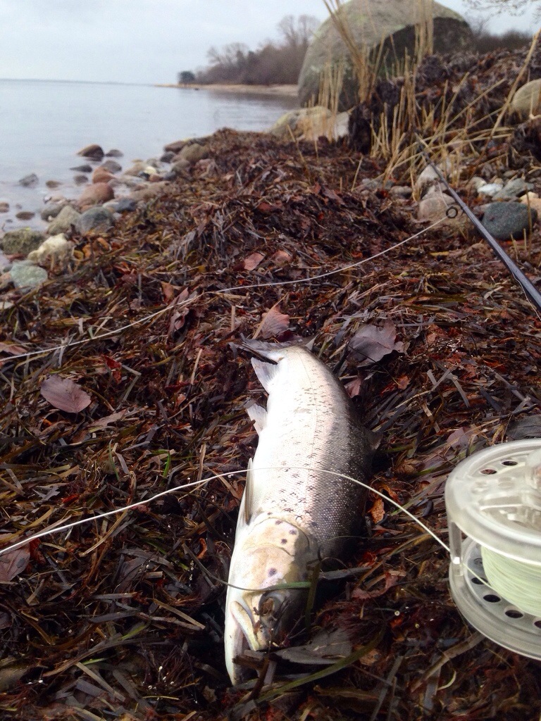 Da jeg kom til nordlige spot var det oplagt at prøve at affiske revet med alt blæretangen tæt på overfladen. Efter en 10 minutter var der en havørred der meget forsigtigt brød overfladen. Det var fisk over målet og det var måske de små sort fluer langskysten der havde fået den lokket til overfladen. Kobberbassen blev “smidt” ud i hovedet på fisken. Efter 4-5 hurtige træk i linen kom hugget. Denne blev fisken godt kroget. Ørreden hoppede et par gange men måtte til sidst overgive sig …