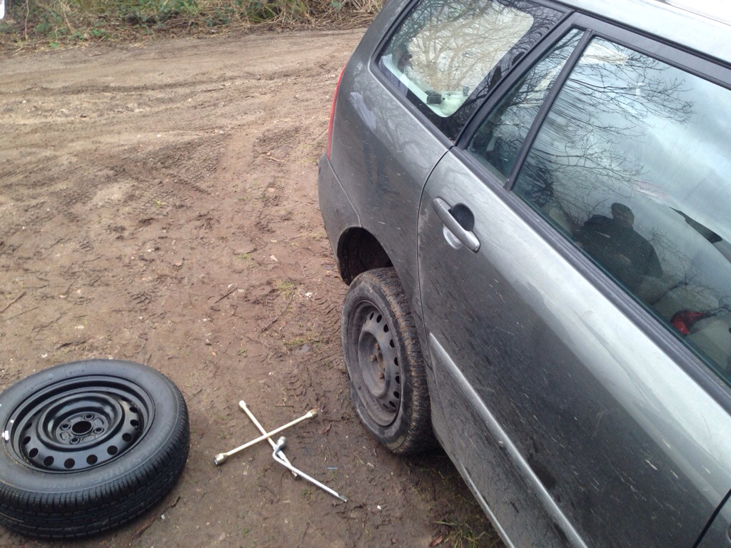 Tiden var gået og børnene skulle hentes i institutionen. Da jeg nåede p-plads kom dagens surprice da baghjulet var punkteret. Pokkers osse.