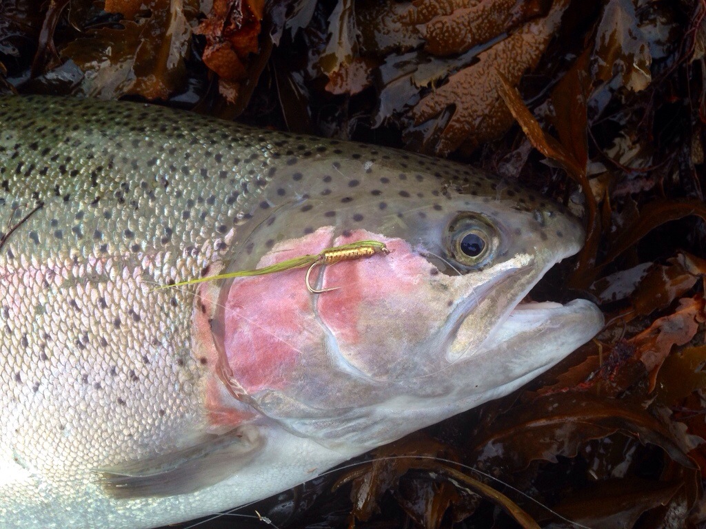 Jeg fiskede et par timer i bramsnæsvig i dag og fangede en enkelt regnbue og mistede en til, der spyttede fluen ud mens den hang en lille meter over vandoverfladen :-). Begge huggede meget forsigtigt. Havørreder så jeg ikke skyggen af.