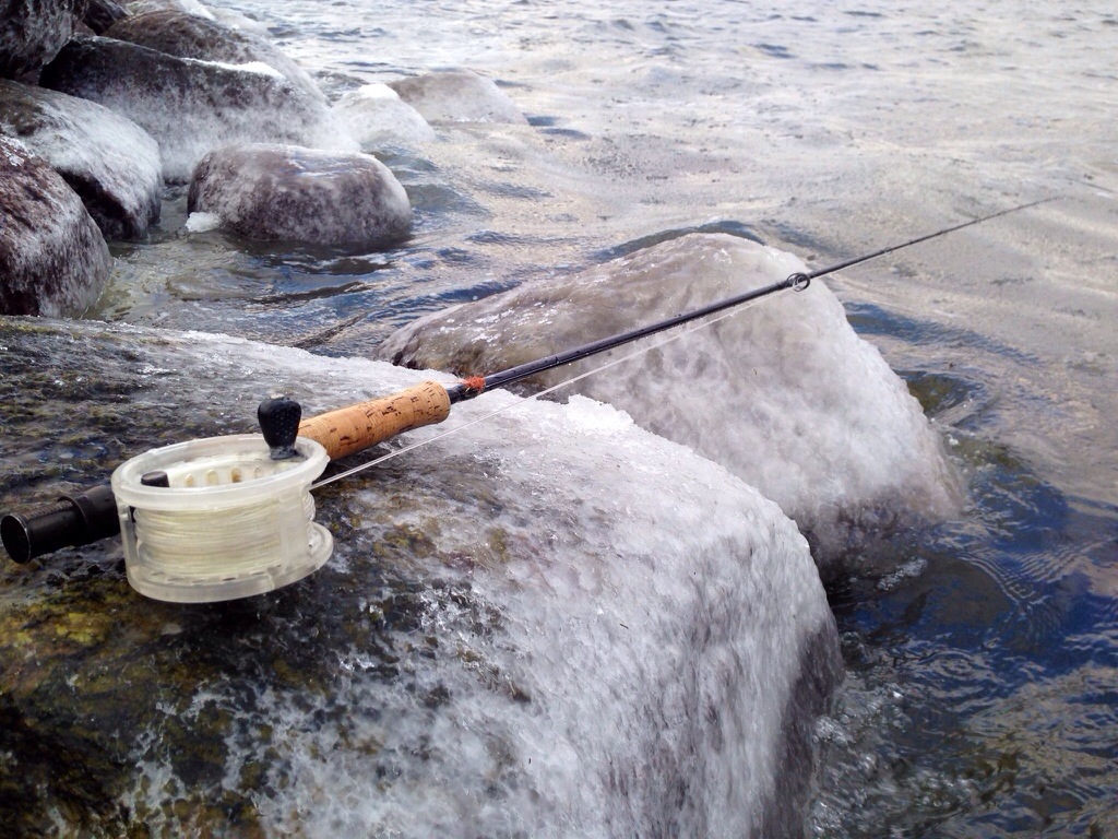 En ordentlig regnbueørred hoppe fri af overfladen og så var der godt nok kommet flex klingen. Til sidst var det tid til landing i grød-isen. Så kan man næsten kalde det regnbueørred on the rocks.