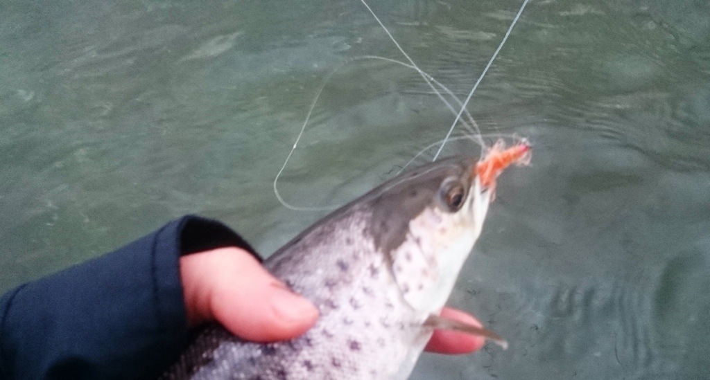 Længere ude mødte jeg en bombarda-fisker, som lige havde landet en fin fisk på 2,5 kg. Jeg snakkede med ham, og han fortalte, at han havde fået ti fisk i løbet af dagen. I mens vi snakkede fik han endnu en fisk på omkring 45 cm. Jeg begyndte at fiske, men mærkede intet. Fiskeren ved siden af mig fik yderligere to undermålere. Stadig intet. Jeg fiskede med samme flue -Pattegrisen – og jeg fiskede den rimelig hurtigt. Jeg plejer, lige som Lars anbefaler, at holde mig til samme flue, for ikke at have for mange variabler at arbejde med. Da fiskeren ved siden af mig fik endnu en fisk, måtte jeg prøve at ændre noget. Jeg indlagde nogle pauser i indtagninger. Det har jeg tit oplevet kan udløse et hug fra forsigtige fisk, når jeg fisker med rejefluer. De første par kast gav intet. Efter et par kast mærkede jeg en fisk, der forsigtigt slog til fluen. Jeg krogede den ikke. Jeg lavede en pause og derefter et par hidsige indtagninger. Intet. Jeg kastede igen, og mærkede igen et meget forsigtigt hug. Jeg satte hastigheden op – resultatet var det samme som før. Intet. Jeg lagde linen ud igen. Men denne gang tog jeg fluen ind i langsomme, lange tag. Efter få meter kom et voldsomt hug. Fisken blev siddende. Og en lille fin ørred kunne kort tid efter svømme tilbage i fjorden, så den kunne vokse sig større.