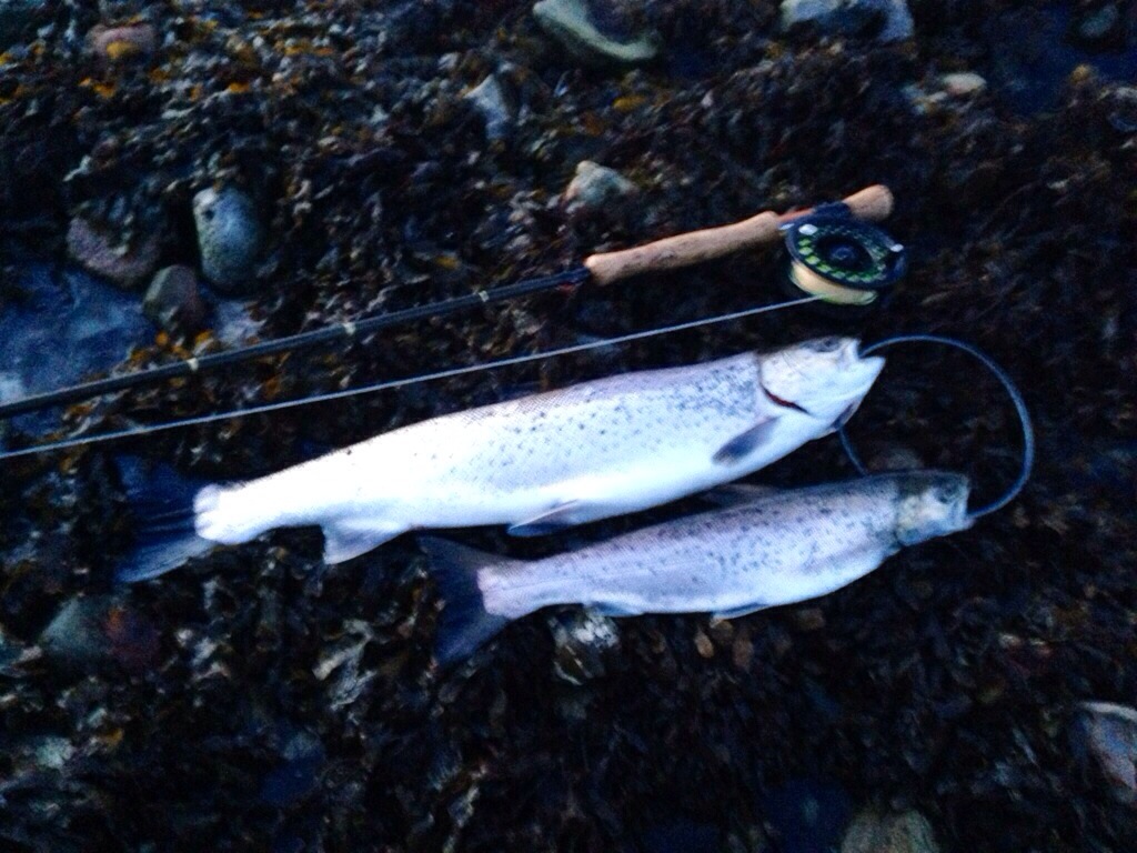 Først da solen var vej ned i horisonten kom de to velfortjente fisk på land, en målsfisk og en dejlig hårdt feight’ende ørred på 55 cm, blank og med løse skel, efter 8 lange men dejlige timer i fjorden.