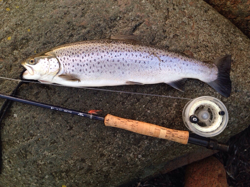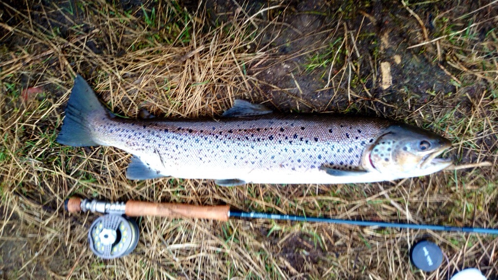 Min fiskekammerat blev et par timer længere på spottet og fik et rigtigt godt hug på hans Kobberbasse flue. Det viste sig at være et stor nedgænger som hurtigt kom tilbage i vandet efter et fotos. Senere gik fiskeriet helt dødt.