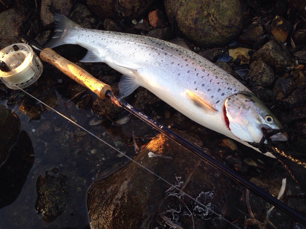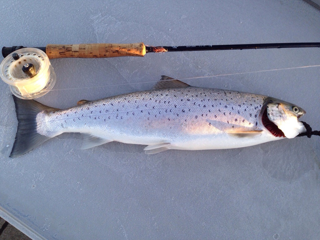 Få sekunder efter hugget kom en flot fuldfed havørred hoppende ud af vandet og landende mellem isflager. Et par hop mere overbeviste mig om at det måtte være en overspringer 🙂