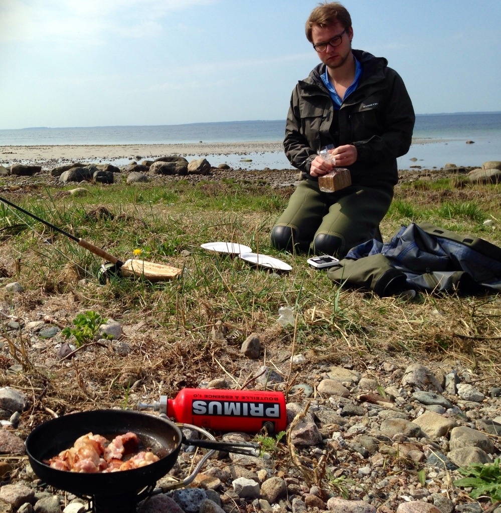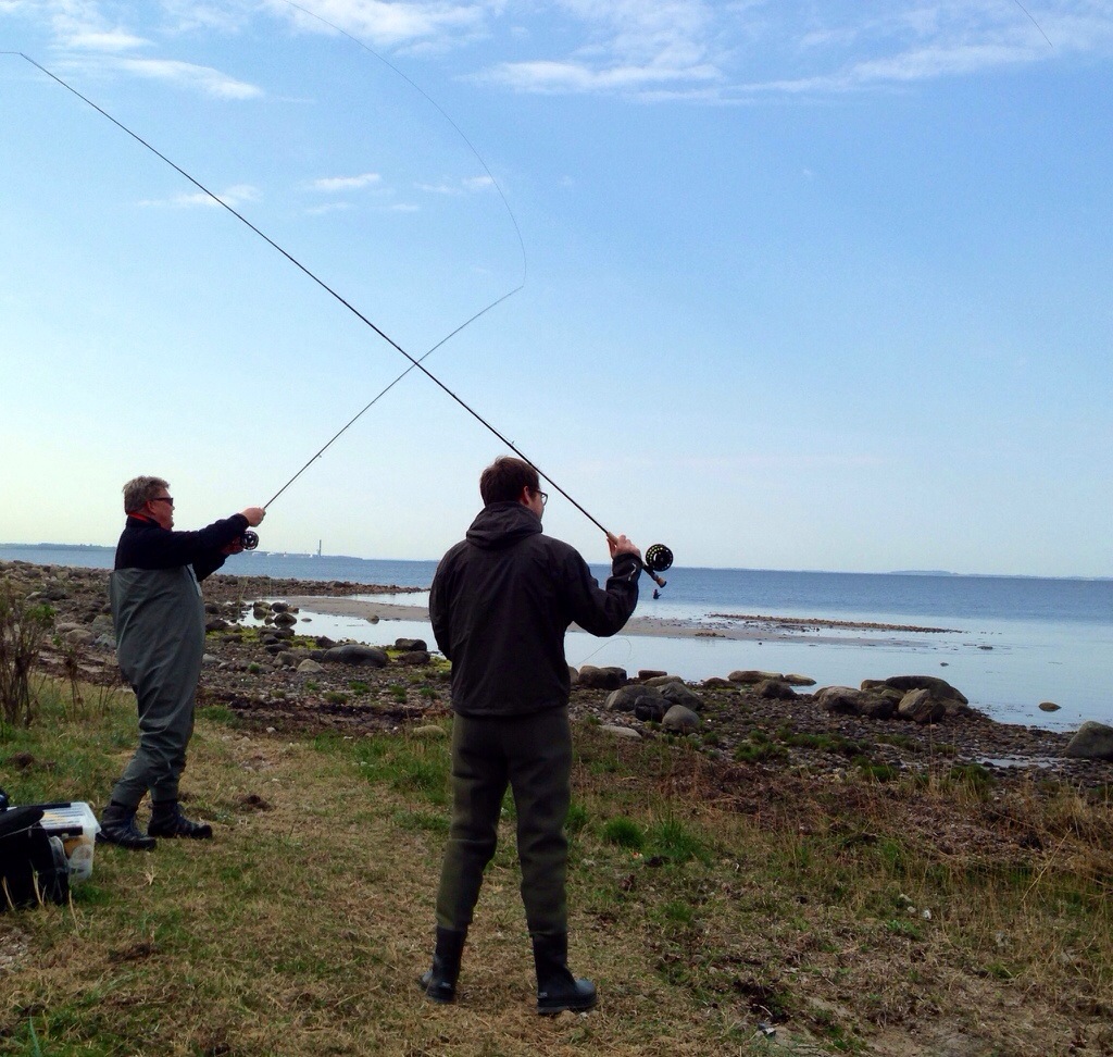 Vel ankommet og i fuld udrustning gik vi i gang med fluekaste-træning ved strandkanten.