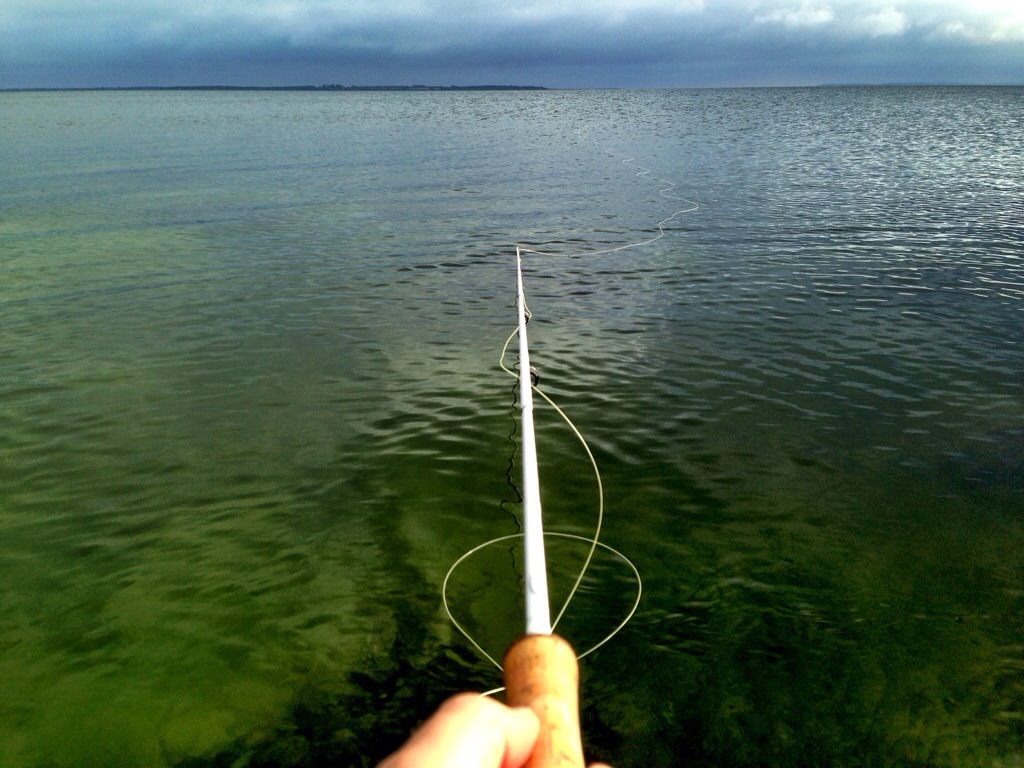 Senere fiskede jeg hen efter et fint mørkt bælte med blæretang. En mindre havørred brød forsigtigt overfladen. Fluen blev placeret og kort efter var der bud efter Kobberbassen.