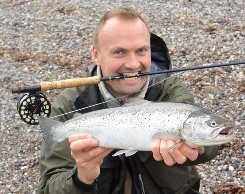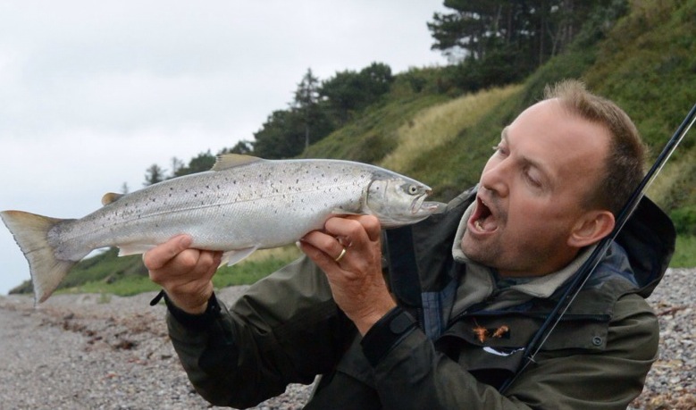 Til sidst måtte den vel-konditioneret havørred overgive sig og jeg kunne kane fisken op i vandkanten. YES – fedt blev der råbt flere gange 🙂