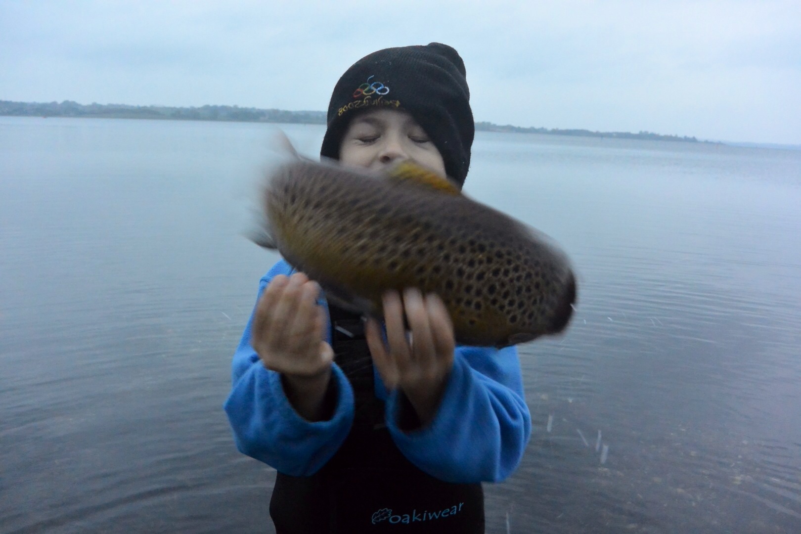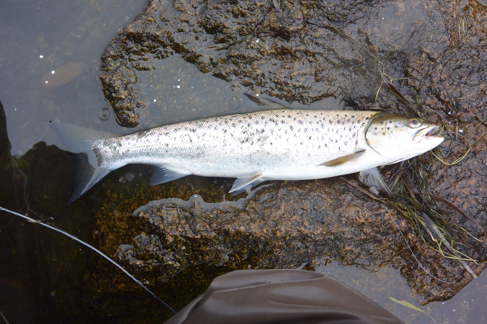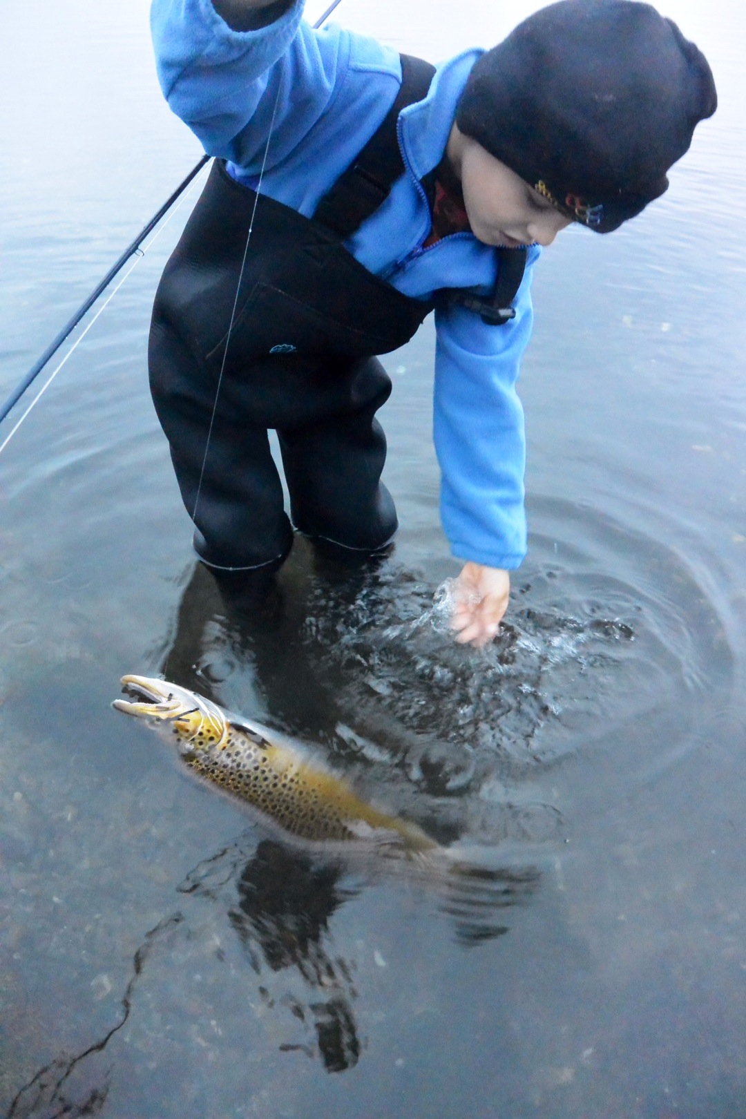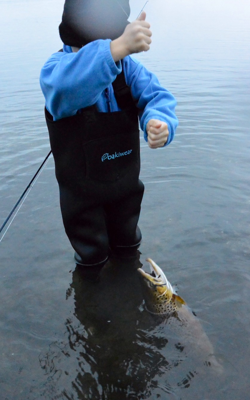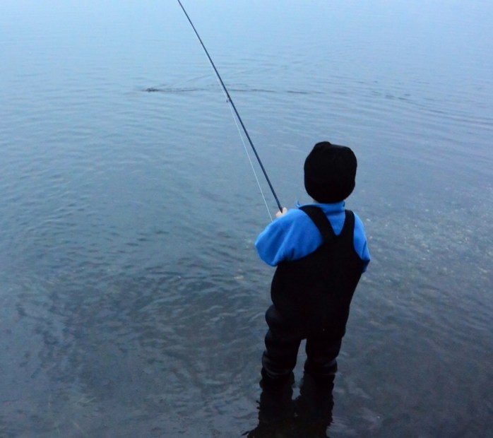 Sønnike blev “monteret”i neopren vaderes og en god regnjakke. Vi gik ned til vandet og inden vi nåede vandkanten viste der sig den første fisk helt fri af vandet.