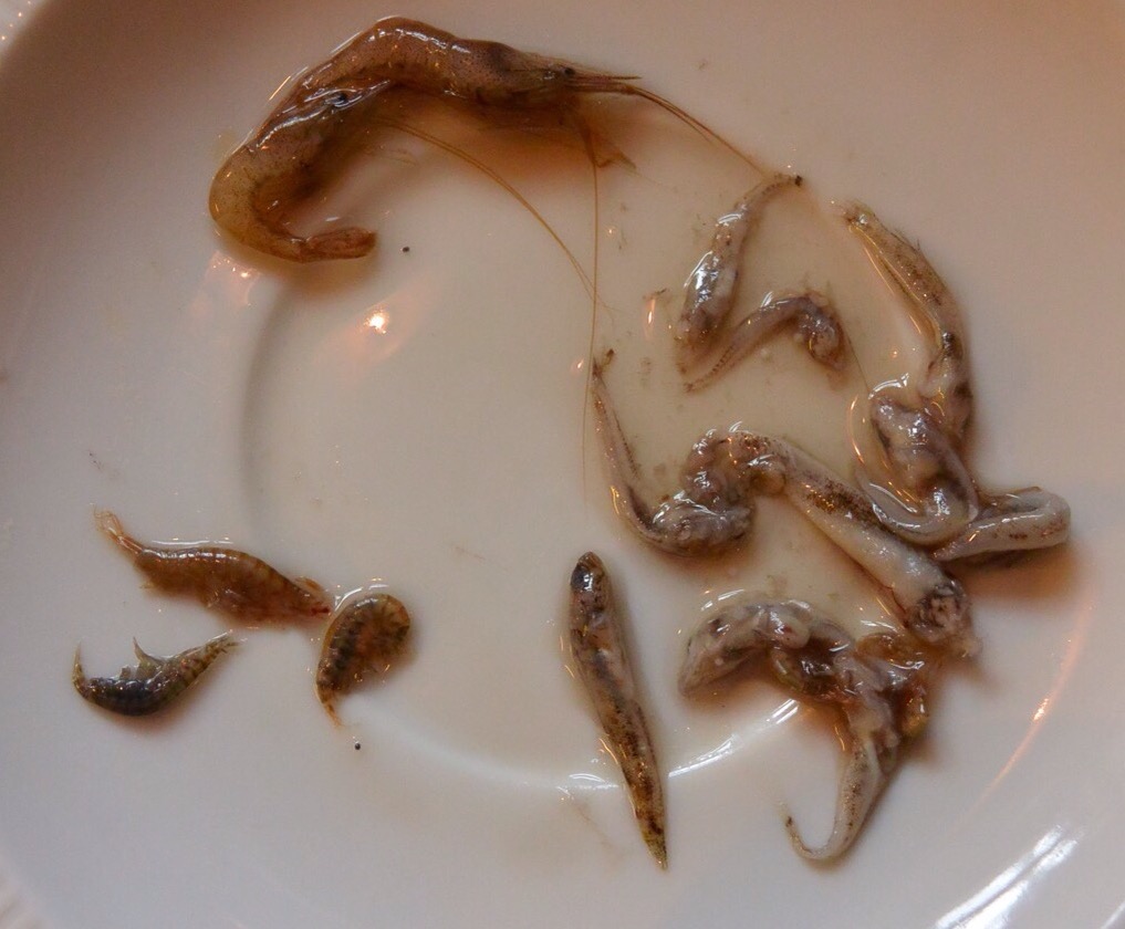 De viste sig at havørreden havde guffet kutlinger, rejer og tanglopper. Det var lidt en overraskelse at se så mange forskellige fødeemner i maven på denne årstid. Det tyder på at der stadigvæk er godt med mad i den ydre del af fjorden.