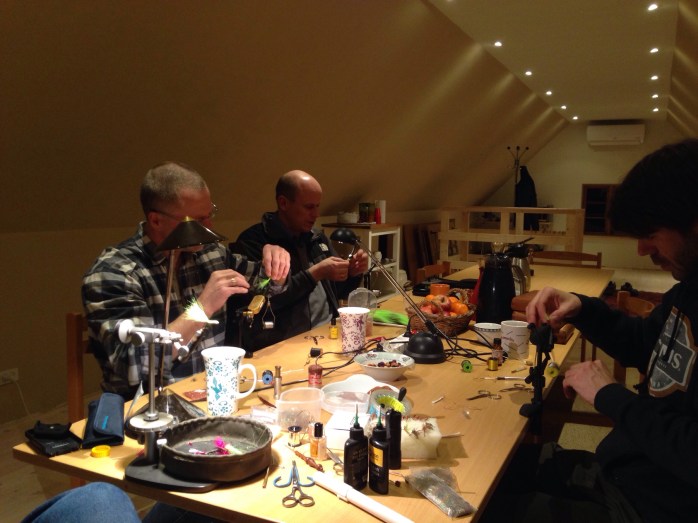 Torsdag var der igen gang i fluebinderiet på mit landsted. Vi nåede gennem fem fluer på dette begynder fluebindingskursus.