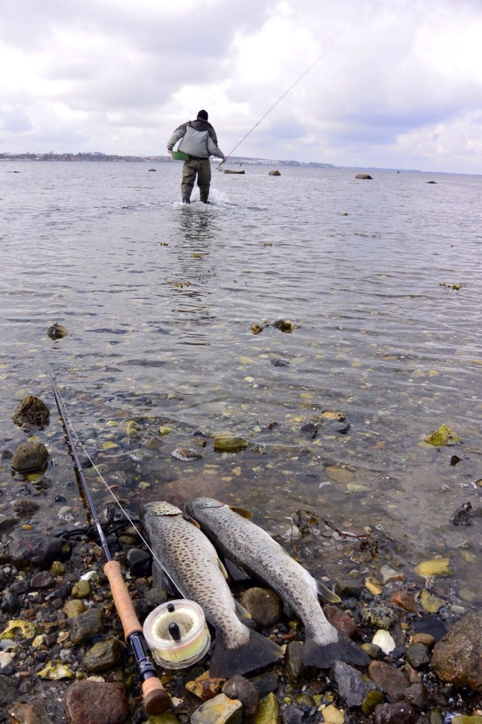 En flot fulfed-havørred over målet havde taget kobberbasse-fluen tæt på land. Så gik det ellers løs med fangsterne og jeg vi samlet flok så det affiskede strækket systematisk.