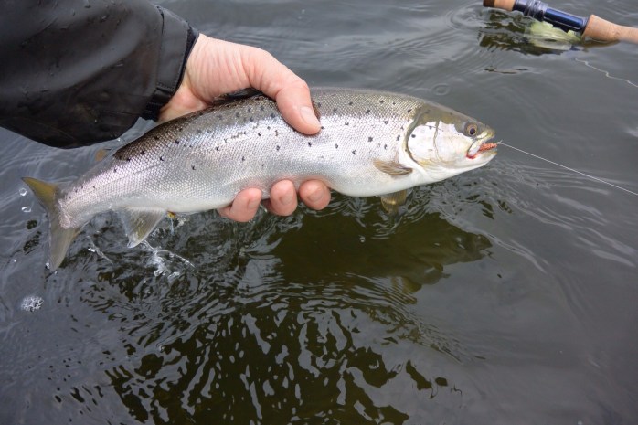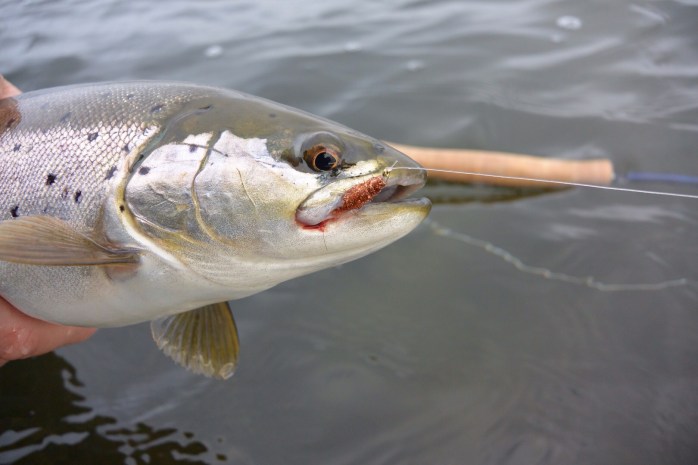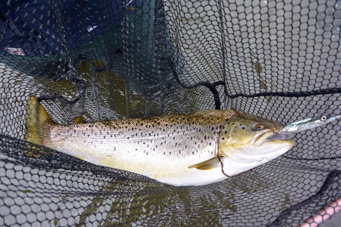 Vi fik landet fisken og blev noget overrasket over at se denne tomle-tykke havørred der havde form som en overvægtig regnbueørred. Jeg så at den havde en masse børsteorm hængende ud af mundvigen og maven var helt sikkert fuldt med børsteorm.