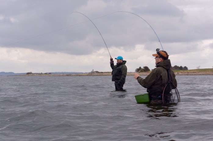 Rene Stougaard fik et rigtig godt hug på blinket og fisken tog nogle voldsomme udløb. Jeg kom over for at hjælpe Rene med at lande fisken der endnu ikke havde vist sig. Det er næsten altid en god ide at blive på det dybe vand da det gør landingen mere sikkert. Fisken er mere tryg og du skal ikke have fisken gennem en masse tang-buske på vej ind. Sidste fordel er også at man er hurtigere er klar til fiske videre når flokken er inde.