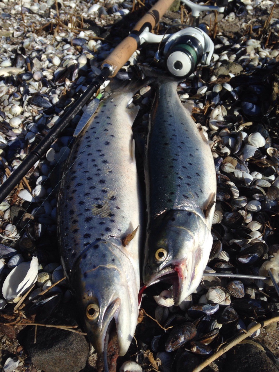 Var hos en kunde og kunne lige nå at fiske 45 minutter i den nordlige ende af fjorden inden jeg skulle hjem og hente unger. Det blev til 2 havørreder på 42 og 47 cm. Begge gylpede børsteorm og havde maven fuld af tanglopper. Mistede en på ca samme størrelse og havde også et par fede hornfisk som slap fri.