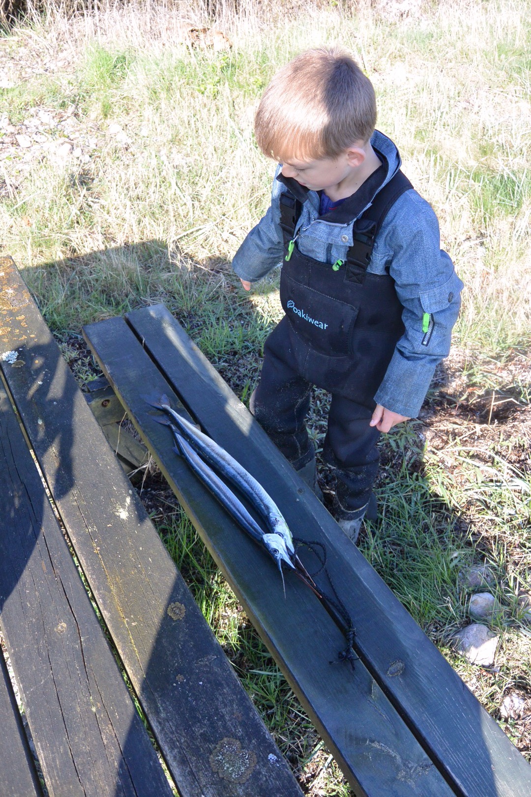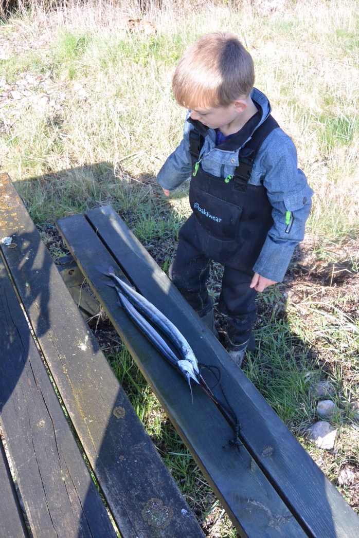 Emil fik fanget dagens første hornfisk og den særdeles hård fight da den nærmest blev rullet i land.