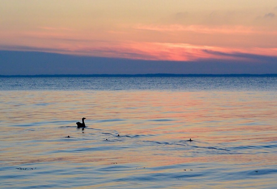 En gåse-mor med sin små gæslinger er et smukt syn i solopgangen. Jeg fik stempelt en del hornfisk over blæretangsbælterne.