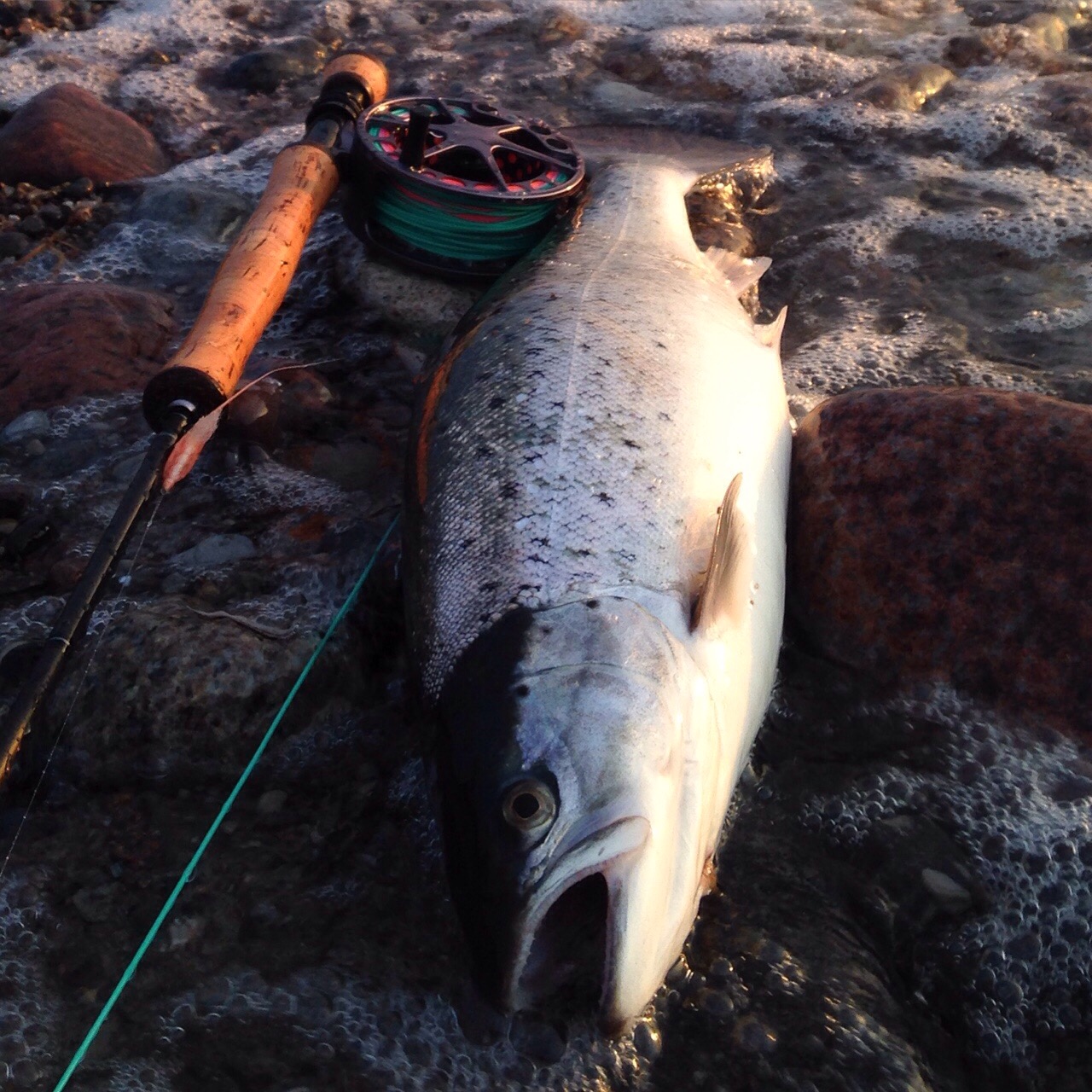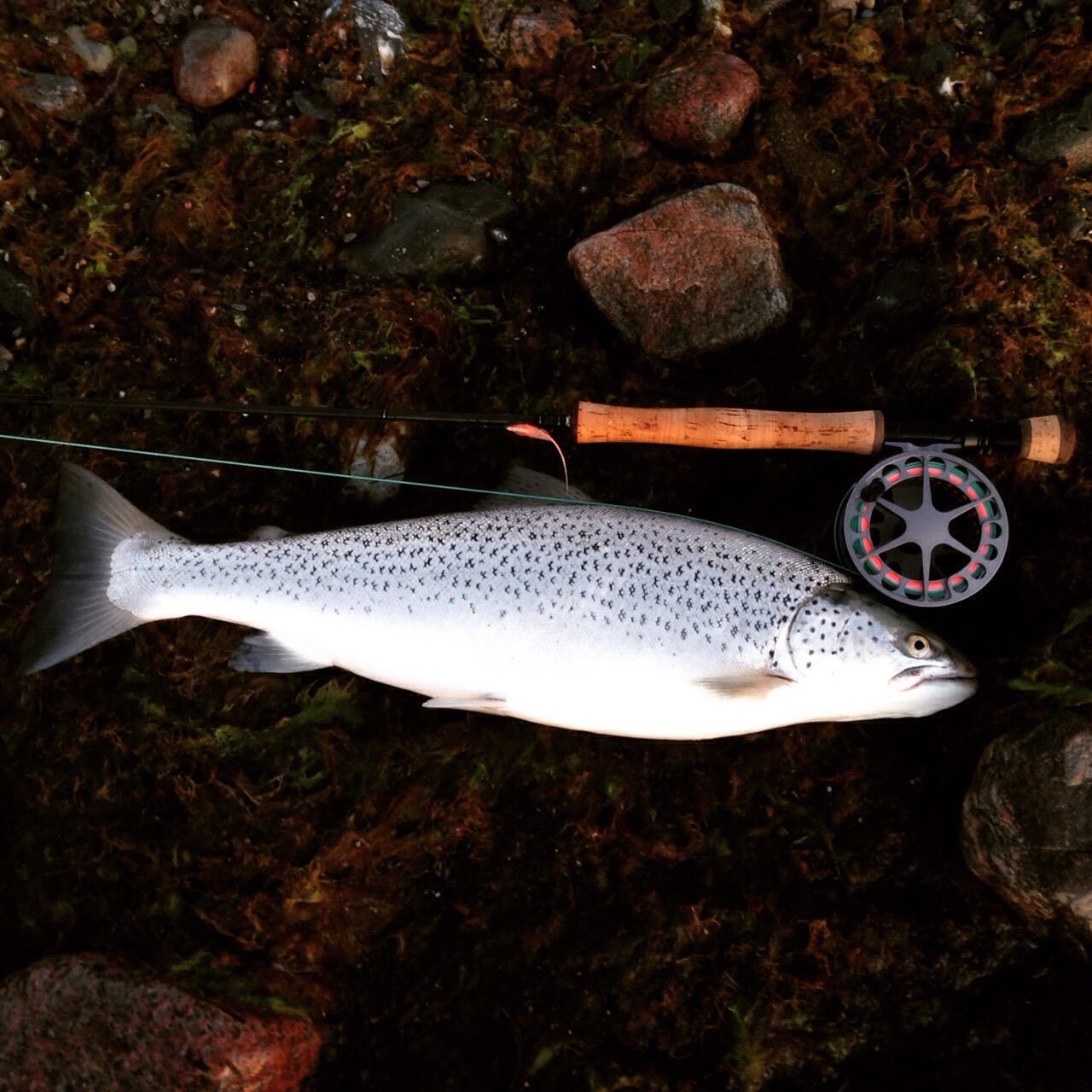 Jeg trak linen af fluehjulet og stilte mig på den sten jeg stod på igår. Tog mit første kast og skræmte nogle hornfisk. Det var tidligt de var her tænkte jeg men så skulle der da nok komme lidt horn på land om ik andet. Efter 30 minutters tid med masser af hornfiske hug mærker jeg pludseligt et hårdt træk i linen. Da jeg sætter krogen i modhugget pisker en havørred overfladen til skum og springer fri af vandet. Den lød som en stor sten der blev smidt i vandet da den landte. Det var en god fisk sagde jeg højt selvom jeg stod alene på pladsen. Efter en lang og tung fight med et par mindre udløb fik jeg landet den flotteste havørred jeg til dato har fanget. 60 cm rent målte jeg den til. Den var samtidig tromle tyk og lynende blank. Da jeg havde siddet og beundret den i det flotte lys der nu var kommet tænkte jeg at der måske var flere der ude. Ud på stenen igen og bade pattegrisen. Fik hurtigt en havørred på som desværre hoppede af. Det virkede som om der kun var horn efter lyset kom frem. Jeg skiftede til en rejeflue i lidt mere neutrale farver. 2 kast og jeg fik en havørred mere på små 45 cm. Sluttede af med en hornfisk og så pakkede jeg sammen og gik mod bilen. Den flotte havørred som vejede 2,5 kg skulle fejres med morgenbrød og basser til familien som lige havde skrevet en SMS om at de var vågnet hjemme i huset.