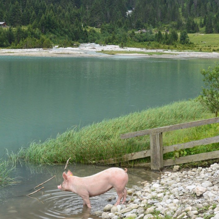 Tre timer fløj afsted og fiskene var ikke blevet mere aktive. Der var stadigvæk lidt overfladeaktivitet længere ude over ved pynten med fjeld-grisene. Det er åbenbart tilladt at have grise ned til vandet i Østrig. Det var lidt mærkeligt at svinge fluen over tre grise i 1500 meters højde.