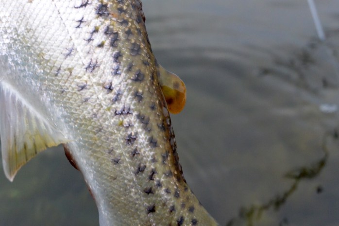 Som billedet viser er fedtfinnen ikke klippet og dermed er det en naturlig reproduceret havørred fra et vores havørredvandløb i fjorden.