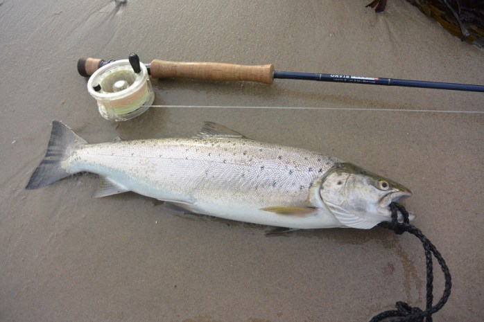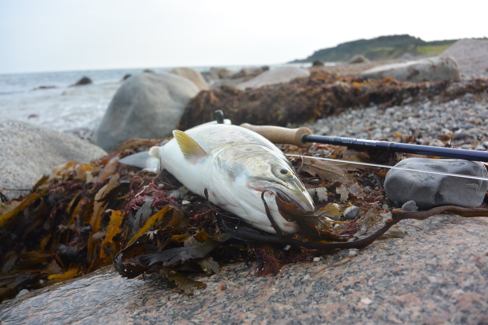 På en lille pynter med et fint blæretangsområde ramte jeg nogle hugvillige havørreder efter der havde været et par Marsvin forbi. Den første havørred var lige under målet og kom hurtigt tilbage i baljen.