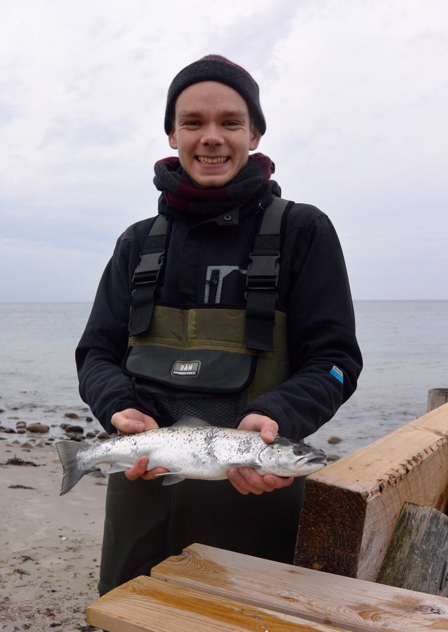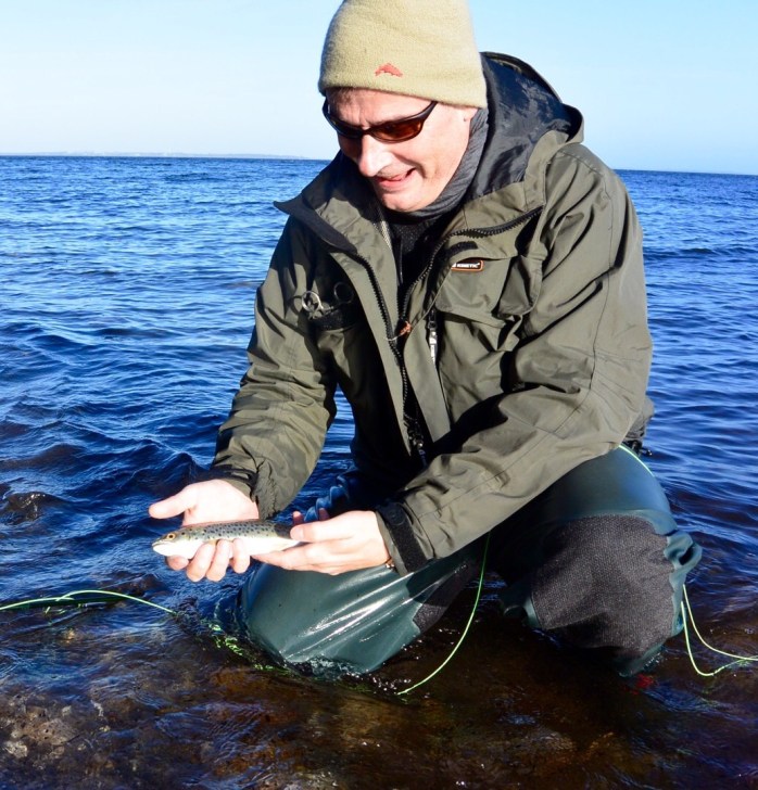 Kim fik sin første havørred på flue og var ikke til at skyde igennem efter den oplevelse. Den blev nænsomt genudsat med håb om gensyn næste år.
