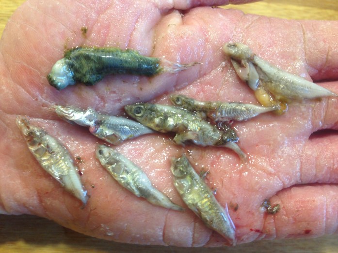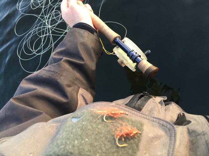 Solen kom frem og Helge Rødgaard Larsen fandt en lille flok havørreder. Tre mindre havørreder havde nappet hans flue og kom hurtigt tilbage i baljen.