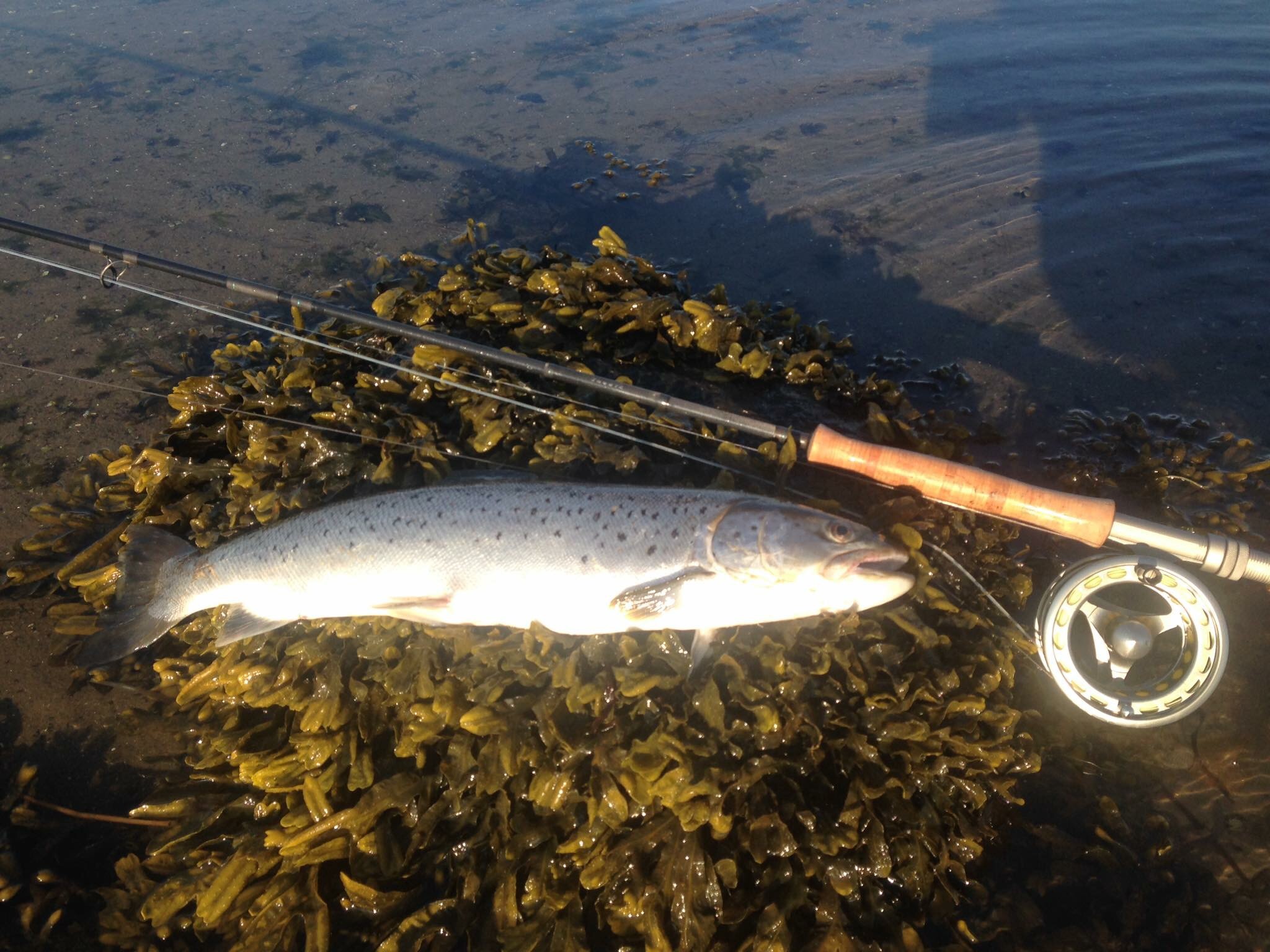 Helge var ihærdig og blev på spottet efter at vi var taget hjem. God prioritering da det viste sig at der kun gik 15 minutter til at Helge en fin hug på sin Guldbassen-flue. Det var flot blank havørred på 50+.