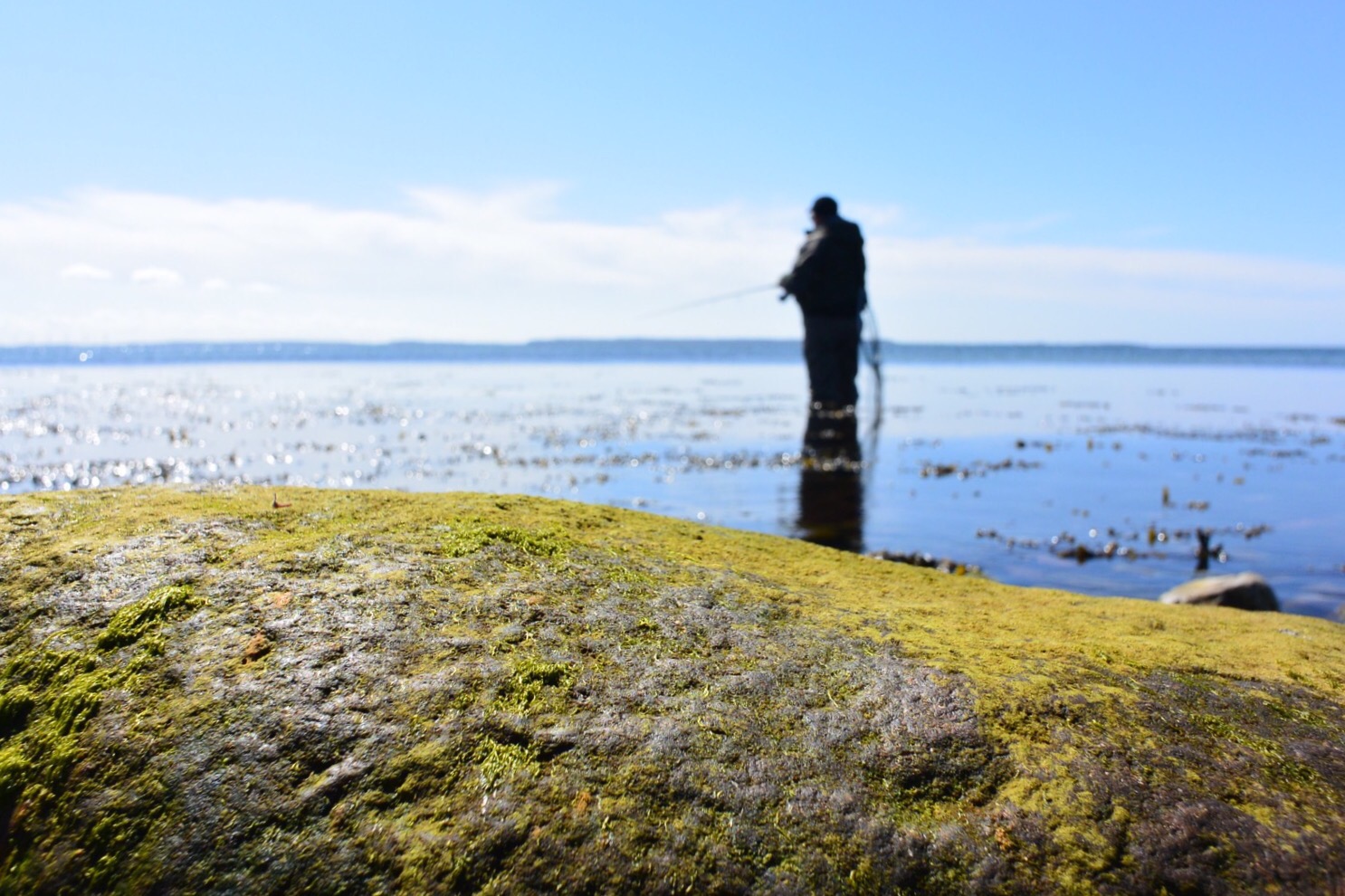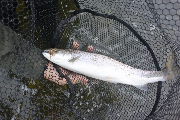 Jeg nappede en fin havørred der jagtede tanglus tæt på land over et lavt blæretangsrev.