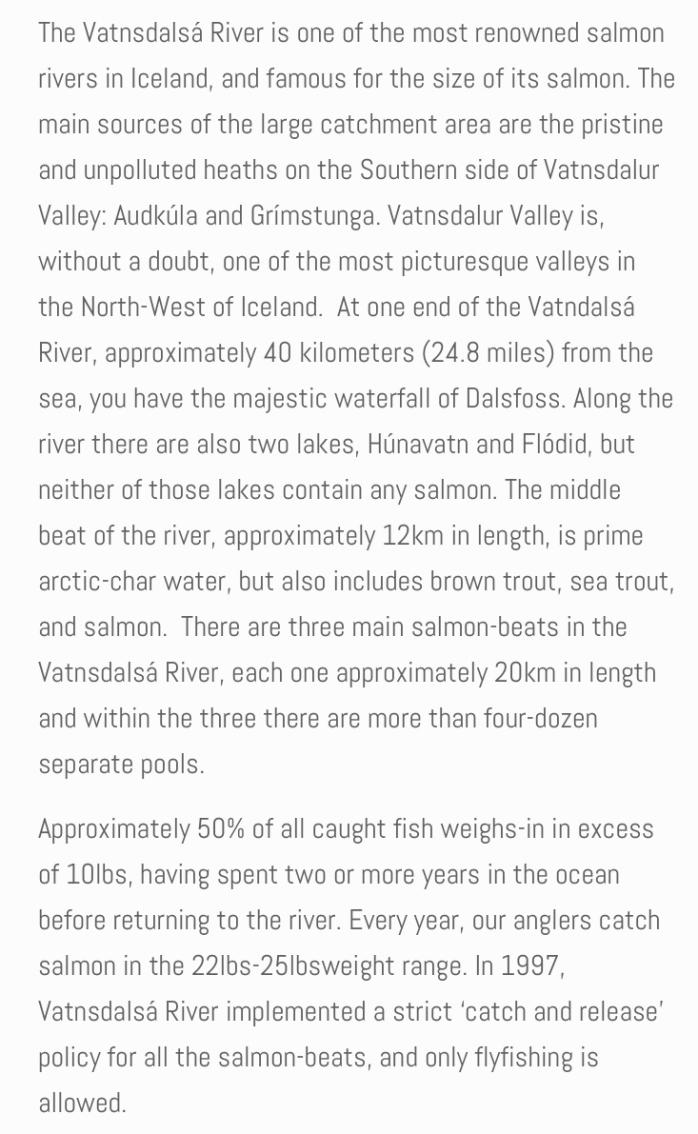 Så er det snart afrejse mod elven Vatnsdalsa i det nordvestlige Island der kendt for sine store laks, rødding- og havørredfiskeri. Den første dag i sæsonen blev der landet 11 laks på timer.