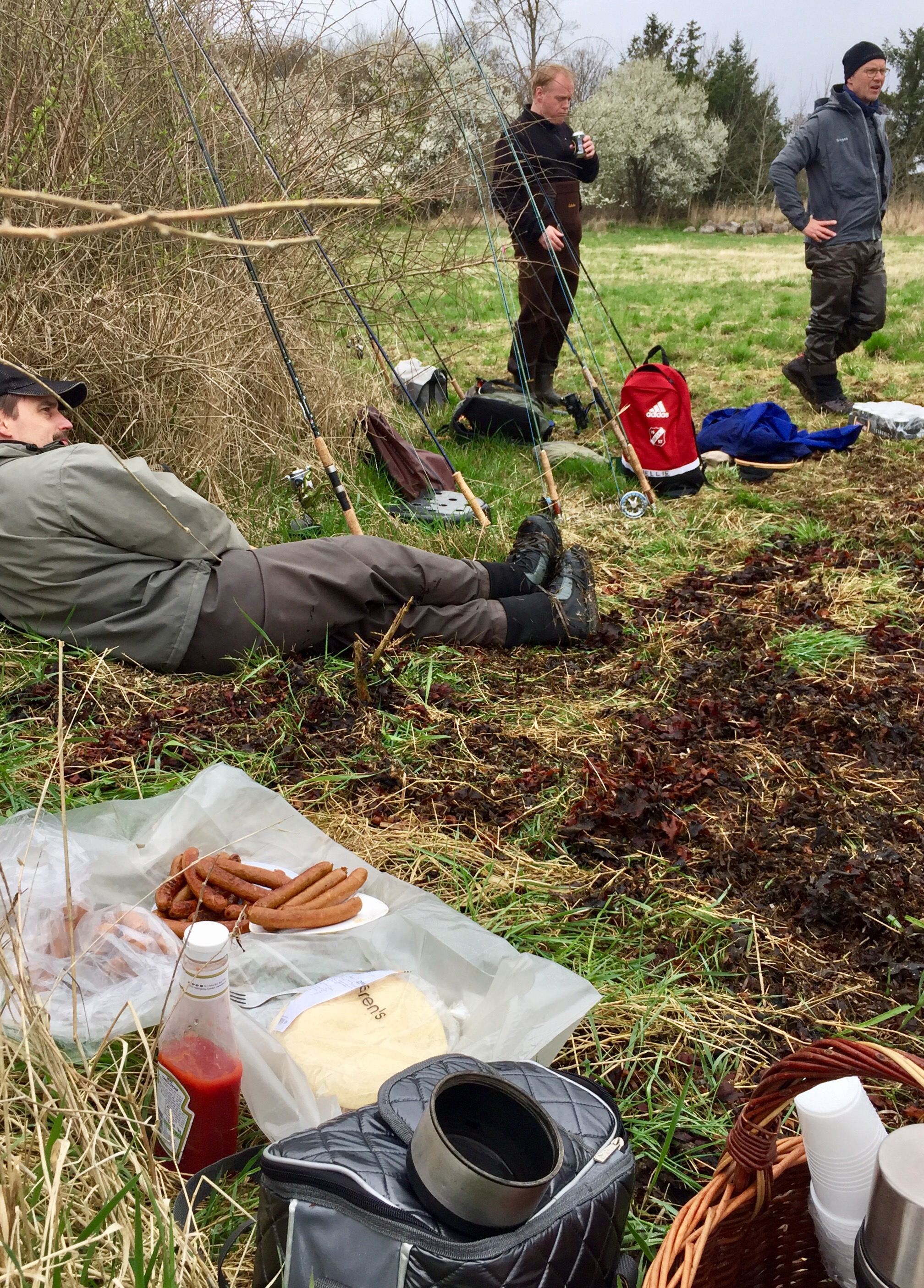 Da grillen (pølser, Pitabrød) blev startet stod “fisketælleren” på 16 havørreder med fire over målet og to fisk der røg af under fight.