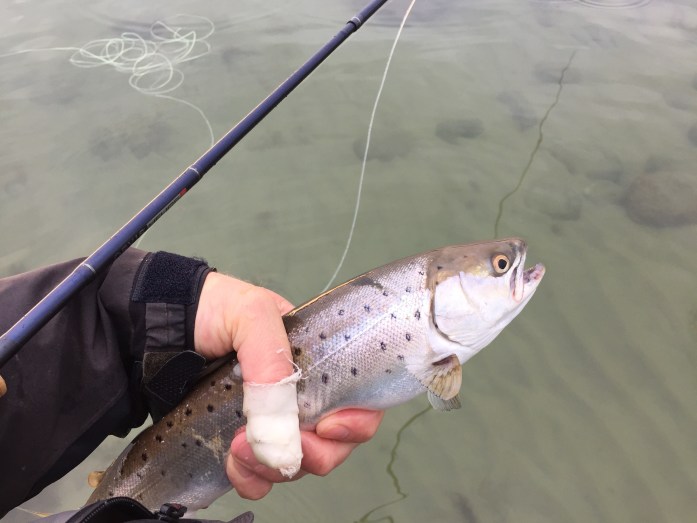 En blankfisk omkring målet blev nænsomt genudsat. Flokken af havørreder var stadigvæk i området og guffede insekter i overfladen. Kobberbassen fik atter en tur ud i flokken og lidt efter var der fast fisk 🙂