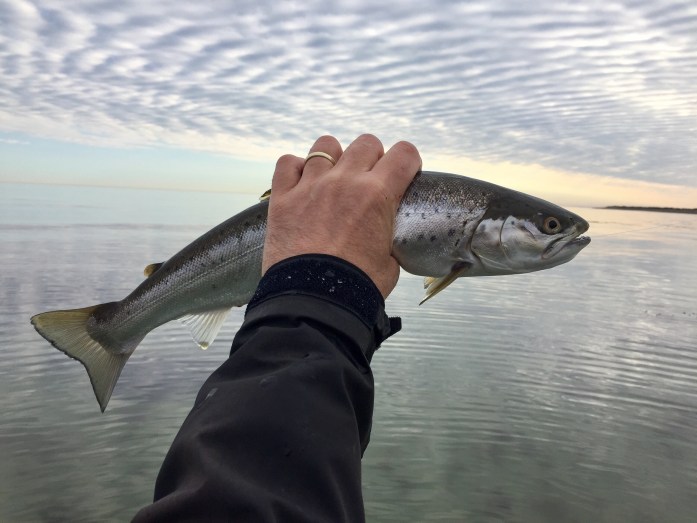 Jeg så flere havørreder forsigtigt bryde overfladen efter de små “sorte”. Hurtigt hen i området med kobberbasse-fluen og igen var der fast fisk. Det blev 7 havørreder på den måde og to kom med hjem. Alle fisk viste sig i overfladen.